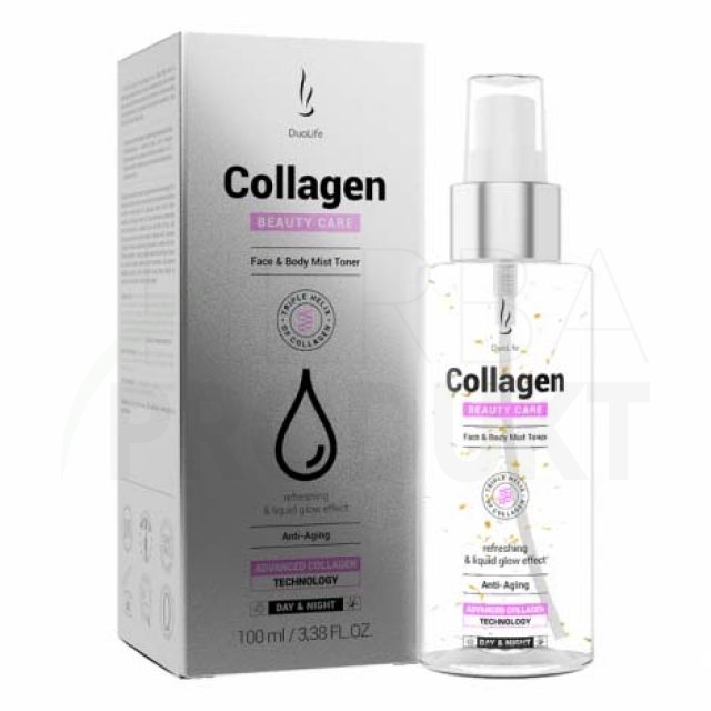 DuoLife Beauty Care Collagen Face & Body Mist Toner je jemná hmla na tvár a telo s čiastočkami zlata, ktorá bola vytvorená s cieľom intenzívne zvlhčiť, osviežiť a tonizovať pokožku a pripraviť ju na aplikáciu ďalšej kozmetiky z radu DuoLife Collagen Beauty Care. Použitý hydrát kolagénu s patentovanou metódou mikrobiologickej a tepelnej stabilizácie chráni pred rozvojom mikroorganizmov a zaisťuje stabilitu produktu pri teplote do 32 °C. Unikátny komplex štyroch druhov 4D kyseliny hyalurónovej vďaka rozdielnej veľkosti častíc jednoznačne zlepšuje hydratáciu vonkajšej aj hlbšej vrstvy pokožky. Drobné čiastočky zlata rozžiaria našu pokožku a dodajú jej prirodzený, zdravý lesk a mladistvý vzhľad.Čistenie pokožky je kľúčovou etapou v každodennej starostlivosti o pokožku tváre, pretože odstraňuje všetky nečistoty a pripravuje pokožku na aplikáciu ďalších kozmetických prípravkov. Tónovanie pleti je dôležitou etapou starostlivosti, na ktorú, bohužiaľ, často zabúdame. Predstavuje akúsi hranicu medzi čistením a starostlivosťou, pretože jej úlohou je obnoviť správne pH pokožky, ako aj osviežiť, upokojiť podráždenia a dodať pokožke cenné výživné látky.
