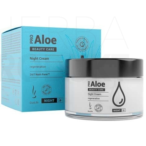 Pro Aloe Night Cream 50 ml je „bohatá porcia prírody“ vytvorená na nočnú regeneráciu pokožky tváre. Produkt má vlastnosti, ktoré obnovujú rovnováhu pH pokožky a má upokojujúci, ochranný, posilňujúci a farbu vyvažujúci účinok. Bohaté zloženie účinných látok obsiahnutých v kréme obnovuje svieži vzhľad pokožky, ktorá sa po prebudení stáva hydratovanou, žiarivou, jemnou a zamatovou na dotyk.