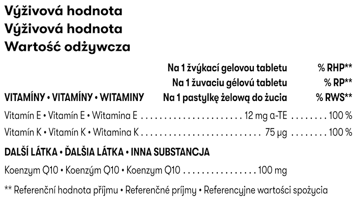 Lahodný, žuvací gélový doplnok s obsahom CoQ10, vitamínom E a vitamínom K.