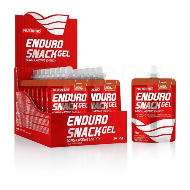 ENDUROSNACK GEL príchuť slaný karamel: voda, 31,5% izomaltulóza - Palatinose™ (je zdrojom fruktózy a glukózy), glukóza, zahusťovadlo xantánová guma, taurín, glycín, L-leucín, L-alanín, regulátor kyslosti kyselina citrónová, chlorid sodný, regulátor kyslosti kyselina jablčná, L-izoleucín, L-valín, aróma, konzervanty benzoan sodný a kyselina sorbová, L-karnozín, sladidlá acesulfam K a sukralóza.