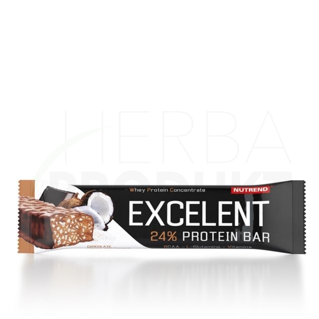 EXCELENT PROTEIN BAR 85 g príchuť - čokoládová s kokosom v pravej mliečnej čokoláde: proteínová zmes (sójový proteínový izolát, srvátkový proteínový koncentrát, sójové vločky), glukózovo-fruktózový sirup, mliečna čokoláda 14% (cukor, kakaové maslo, kakaová hmota, sušené plnotučné mlieko, emulgátory sójový lecitín a E 476, vanilkový extrakt), tekutý invertný cukor, rastlinný tuk (z palmových jadier, palmový, bambucký), krém s lieskovými orieškami (cukor, palmový a bambucký olej, sušená srvátka, lieskové orechy, kakao, emulgátor sójový lecitín, aróma), kokos 4% (kokos, antioxidant oxid siričitý), ryžový extrudát (ryža, emulgátor E 471), emulgátor repkový lecitín, kakao, L-glutamín, aróma, zahusťovadlo guarová guma, antioxidant zmes prírodných tokoferolov, nikotínamid, riboflavín. Môže obsahovať stopy iných druhov orechov, arašidov a sezamu.