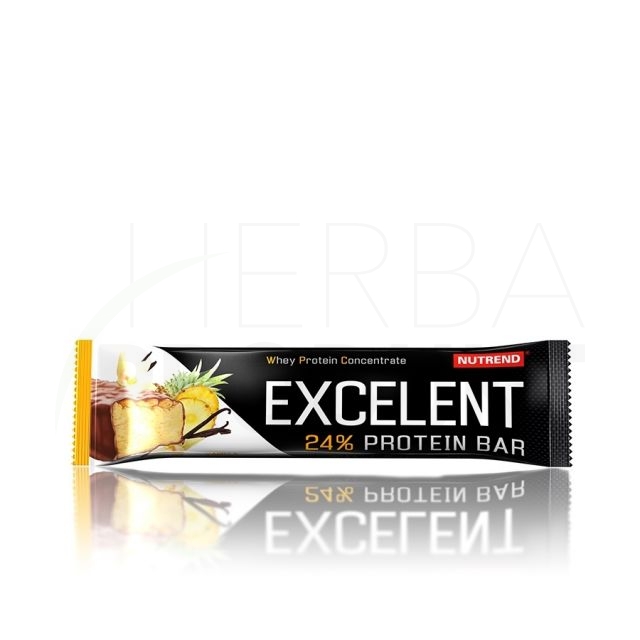 EXCELENT PROTEIN BAR 85 g príchuť - vanilková s ananásom v pravej mliečnej čokoláde: proteínová zmes (sójový proteínový izolát, srvátkový proteínový koncentrát, sójové vločky), glukózovo-fruktózový sirup, mliečna čokoláda 14% (cukor, kakaové maslo, kakaová hmota, sušené plnotučné mlieko, emulgátory sójový lecitín a E 476, vanilkový extrakt), tekutý invertný cukor, rastlinný tuk (z palmových jadier, palmový, bambucký), krém s príchuťou vanilky (cukor, palmový a bambucký olej, sušená srvátka, sušené odstredené mlieko, emulgátor sójový lecitín, aróma, farbivo E 160c), presladený ananás 3% (ananás 57%, cukor, antioxidant kyselina citrónová, konzervant oxid siričitý), kokos (kokos, antioxidant oxid siričitý), ryžový extrudát (ryža, emulgátor E 471), emulgátor repkový lecitín, L-glutamín, zahusťovadlo guarová guma, antioxidant zmes prírodných tokoferolov,aróma, nikotínamid, riboflavín. Môže obsahovať stopy orechov, arašidov a sezamu.