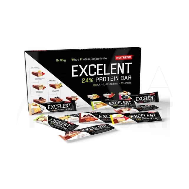 EXCELENT PROTEIN BAR 85 g príchuť - čierna ríbezľa s brusnicami v jogurtovej poleve: proteínová zmes (sójový proteínový izolát, srvátkový proteínový koncentrát, sójové vločky), glukózovo-fruktózový sirup, poleva jogurtová 13% (cukor, rastlinný tuk (palmojadrový, palmový, bambucký) , sušená srvátka a jogurt, emulgátor sójový lecitín, regulátor kyslosti kyselina citrónová, aróma, soľ), tekutý invertný cukor, rastlinný tuk (palmojadrový, palmový, bambucký), krém s príchuťou vanilky (cukor, palmový a bambucký olej, sušená srvátka, sušené odstredené mlieko, emulgátor slnečnicový lecitín, aróma, farbivo E 160c), presladené brusnice 3% (brusnice 77%, cukor, slnečnicový olej), kokos (kokos, antioxidant oxid siričitý), ryžový extrudát (ryža, emulgátor E 471), emulgátor repkový lecitín, L-glutamín, emulzia čierna ríbezľa (aróma, farbivá E 122- môže nepriaznivo ovplyvňovať činnosť a pozornosť detí a E 133), regulátor kyslosti kyselina citrónová, antioxidant zmes prírodných tokoferolov, zahusťovadlo guarová guma, aróma, nikotínamid, riboflavín. Môže obsahovať stopy orechov, arašidy a sezamu.
