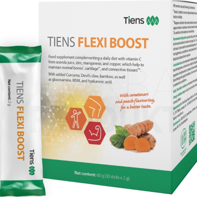 TIENS FLEXI BOOST obsahuje zložky, ktoré prinášajú mnoho benefitov pre zdravie kĺby. Vitamín C z koncentrovanej šťavy z aceroly s prírodnými protizápalovými účinkami podporuje tvorbu kolagénu. Glukosamín pomáha udržiavať zdravé fungovanie chrupaviek a kĺbov. Mangán a meď podporujú normálnu tvorbu a fungovanie spojivového tkaniva. Zinok podporuje udržiavanie zdravej štruktúry kostí. Tieto zložky spolu zlepšujú zdravie kostí, zmierňujú zápaly a podporujú celkovú pohyblivosť a flexibilitu.